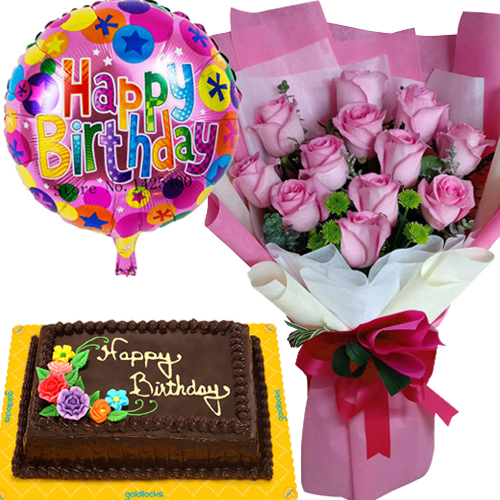 With this 12 Pink Roses in a bouquet with 1pcs Happy Birthday Mylar Balloon and a Choco Chiffon Cake by Goldilocks, you can do just that! The 12 pink roses in the bouquet are beautiful and the mylar balloon and cake are sure to please.
