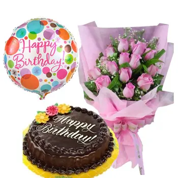 12 Beautiful Pink Roses with Chocolate Chiffon Cake By Goldilocks and 1pcs Happy Birthday Mylar Balloon. ( Balloon design mat vary)