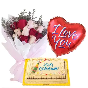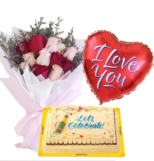 12 Red and Pink Roses with Mocha Chiffon Cake By Goldilocks and 1pcs I love you Mylar Balloon. (Balloon design mat vary)