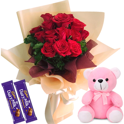 One dozen red roses in bouquet, Cadbury dairy milk 2 bar, 30g. each with a small teddy bear is the perfect way to show your loved ones you care. This beautiful bouquet of red roses is accented with Cadbury Dairy Milk chocolate bars and a small teddy bear, making it a sweet and thoughtful gift.