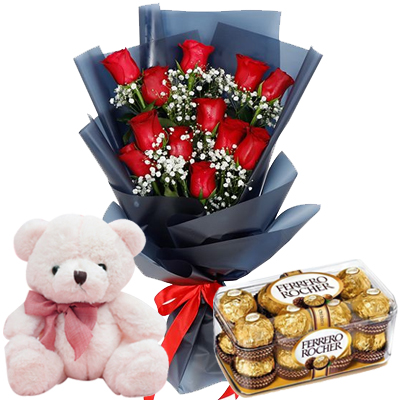 One dozen red roses in bouquet, 16 pcs Ferrero rocher chocolate box with small size teddy bear. Send flowers and gifts to the Philippines with the best online flower shop in the Philippines.