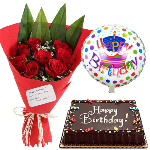 12 Red Roses in a bouquet with 1pcs Happy Birthday Mylar Balloon and a Chocolate Dedication Cake By Red Ribbon.