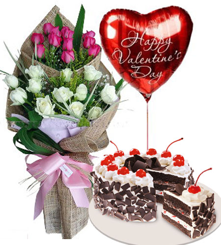 Send them a bouquet of beautiful pink and white roses! This bouquet comes with happy Valentine's Day balloons and a black Forest cake, all tied together with a red ribbon.