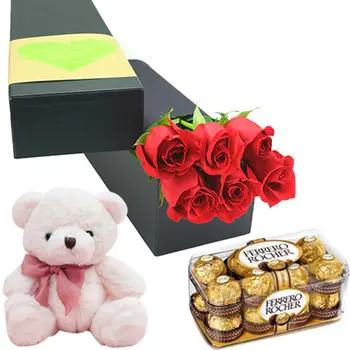 Whether it's a birthday, anniversary, or just because, we've got you covered with our 6 pcs red color roses in a box, 16 pcs ferrero rocher chocolate box with small size teddy bear.