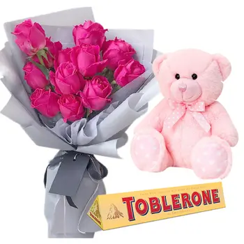 Look no further than our Dozen of Pink Roses with Chocolate Bar & Teddy! This stunning arrangement is sure to put a smile on their face and let them know just how much you care.