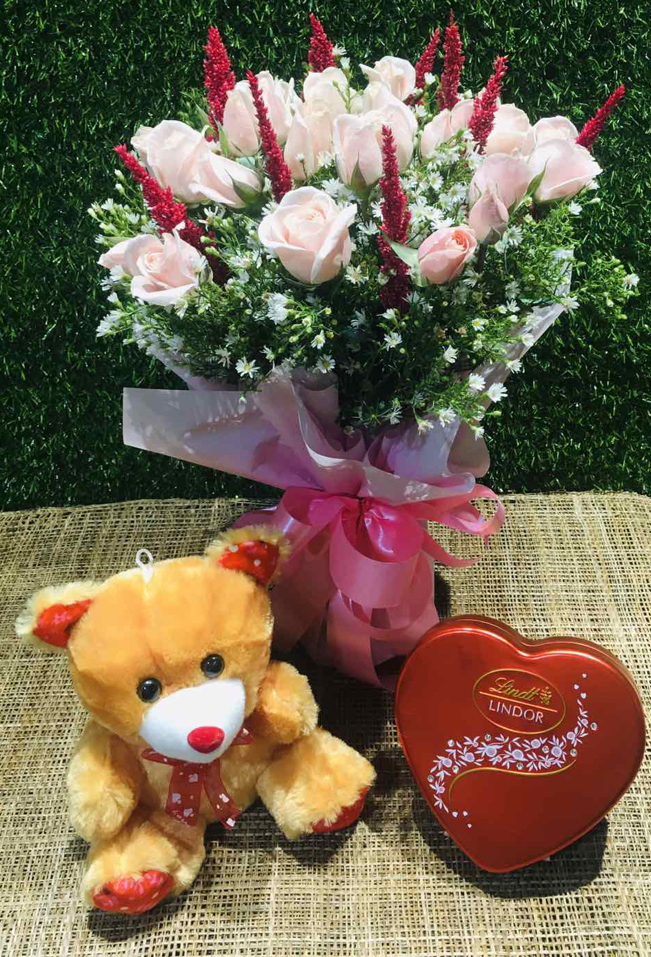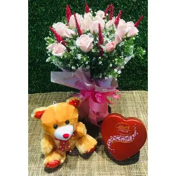 Description: A combo of 12 Light Pink roses in a bouquet with a Lindt Heart Shape chocolate box and a small teddy bear.