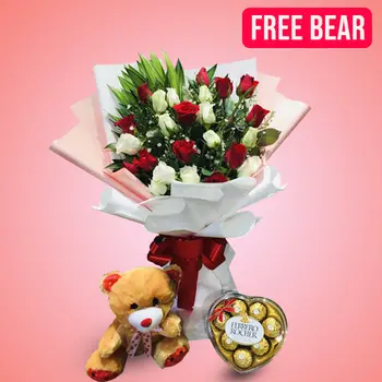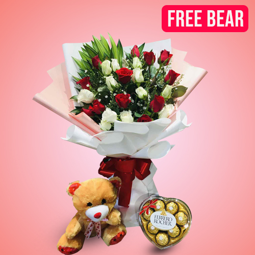 Description: 24pcs Roses and colors are red and white in a bouquet with heart shape Ferrero Rocher chocolate with a Free small size bear. Perfect for birthdays, anniversaries, and romance.