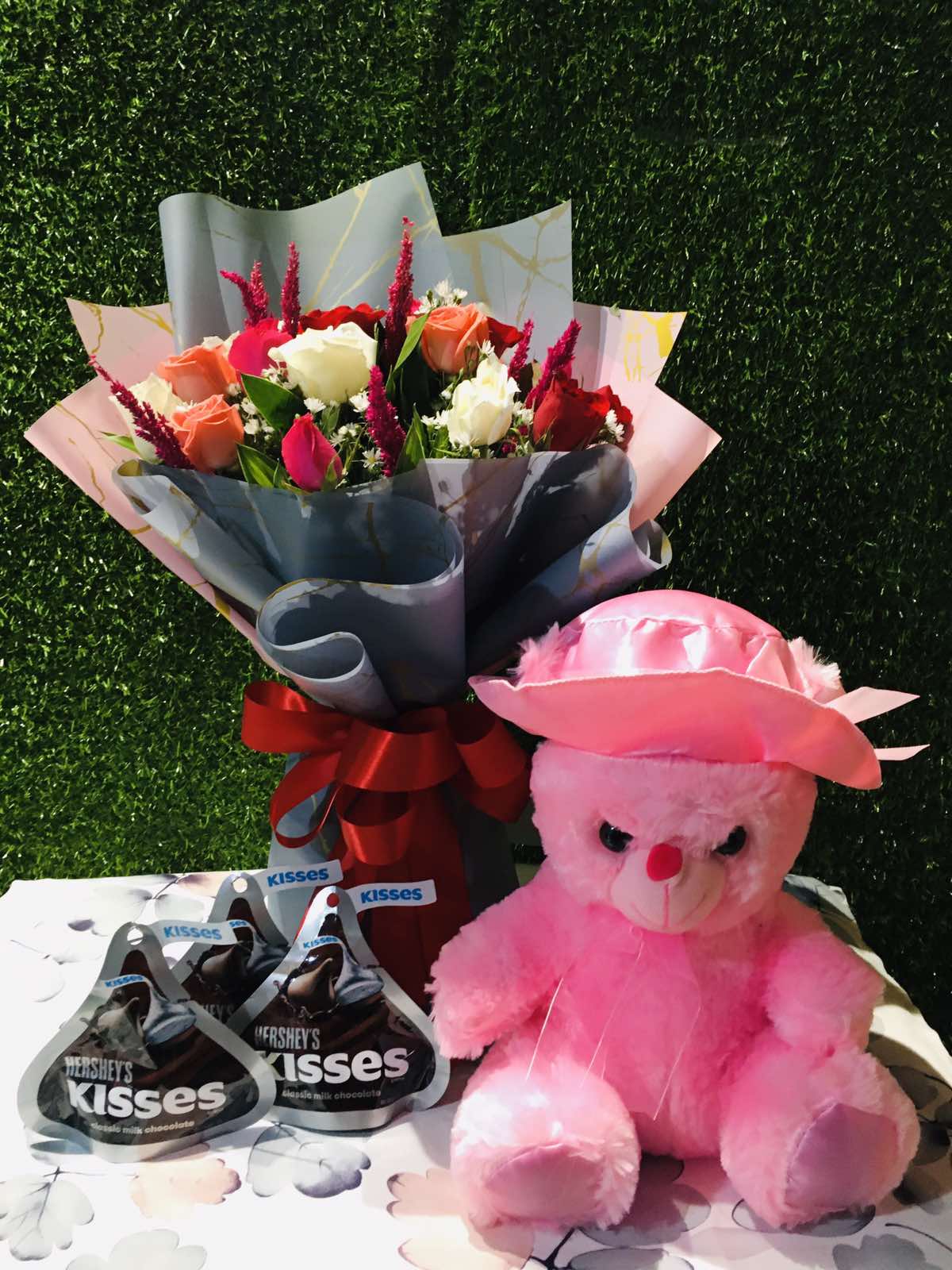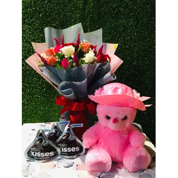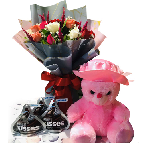Description: Want to surprise your loved ones with a special gift hamper? Be it their birthdays or any other occasion, you can present this gift to show your love. It contains a small cute teddy bear, 12pcs mixed color roses, and 3 packets of 100g. Hershey kisses.