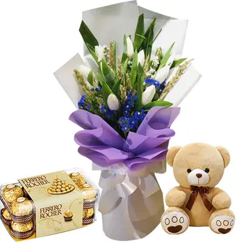 Description: This delightful gift set features a charming combination of six elegant white tulips, 16 decadent Ferrero Rocher chocolates, and a cute small-sized teddy bear. The six tulips are carefully selected for their pristine beauty and presented in a lovely white bouquet, symbolizing purity and innocence. The Ferrero Rocher chocolates, with their signature gold wrapping and delectable hazelnut filling, offer a perfect complement to the tulips, adding a touch of luxury to this thoughtful gift. The small-sized teddy bear, with its soft fur and adorable expression, completes the package, making it the perfect gift for any occasion. Whether you're looking to express your love, and appreciation, or just want to brighten someone's day, this gift set is sure to bring joy to your loved one's heart.